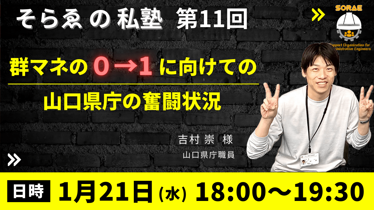 1月21日は、山口県の吉村さんが現状報告を行って頂けます。私の所属する自治体も「群マネ」について、理解が醸成されていません。まずは、自分事として将来に危機意識を持つ、そんなきっかけを提供できるようにしたいです。