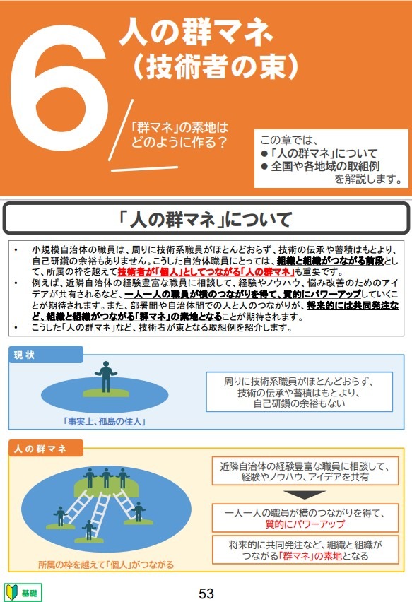 『人の群マネ』とは、『広域・複数・多分野のインフラを「群」として捉えマネジメントする「地域インフラ群再生戦略マネジメント」(群マネ)を進める上で、技術職員も「群」となって広域的に連携し、インフラのメンテナンスに関わるという考え方』