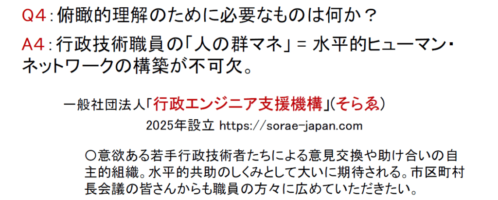 そらゑの『人の群マネ』は、様々な分野の最前線で苦悩する多くの行政エンジニア(主に技術系職員)が、国・都道府県・市町村の立場を越えて集まり束になっています。大前提として、外部の皆様にご理解頂きたいことは、そらゑは、国の政策や上位機関の提言、ならびに多くの既往研究を全否定するつもりは毛頭ございません。むしろ、それら既存の仕組みや見解こそが、種々の問題に対する課題解決への正攻法の正規軍だと考えています。しかし、正攻法や正規軍”だけ”では種々の問題が解決していないのも事実ではないでしょうか。そらゑは、正規軍の対岸から種々の問題や課題を挟撃する”奇襲隊”だとご理解頂けると幸いです。