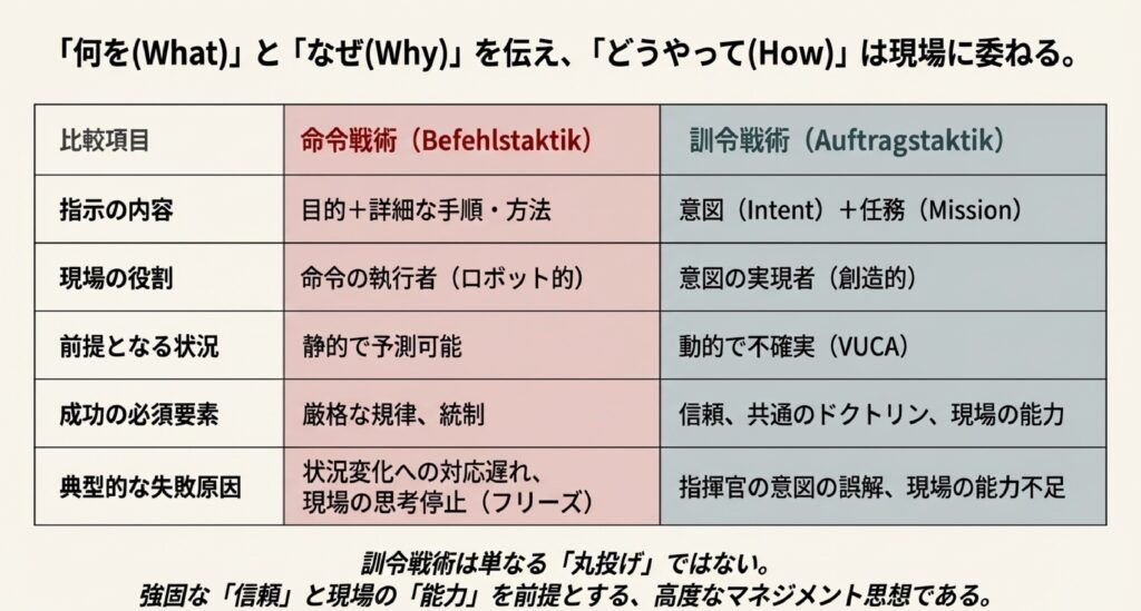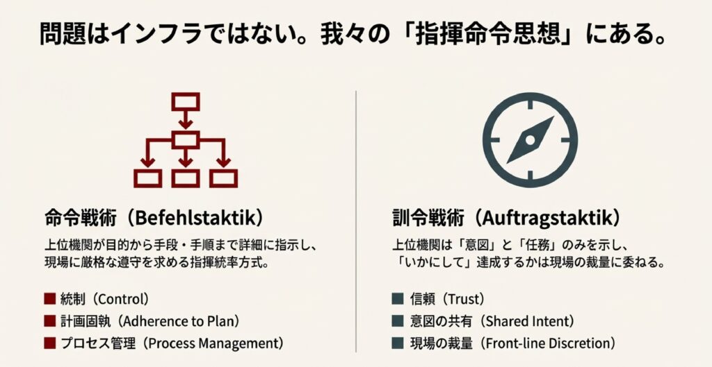 一方、現場にとって、この言葉は「言い訳」ではなく「責任の受容」を意味する。「計画がダメだから失敗した」と嘆くのではなく、計画が崩れたその瞬間からこそが本当の仕事であると認識し、上位機関の意図(Intent)を汲み取りながら、自らの知恵(Phronesis)で最適解を導き出す覚悟が求められる。これこそが「訓令戦術」が現場に求める規律あるイニシアティブ(Disciplined Initiative)である。