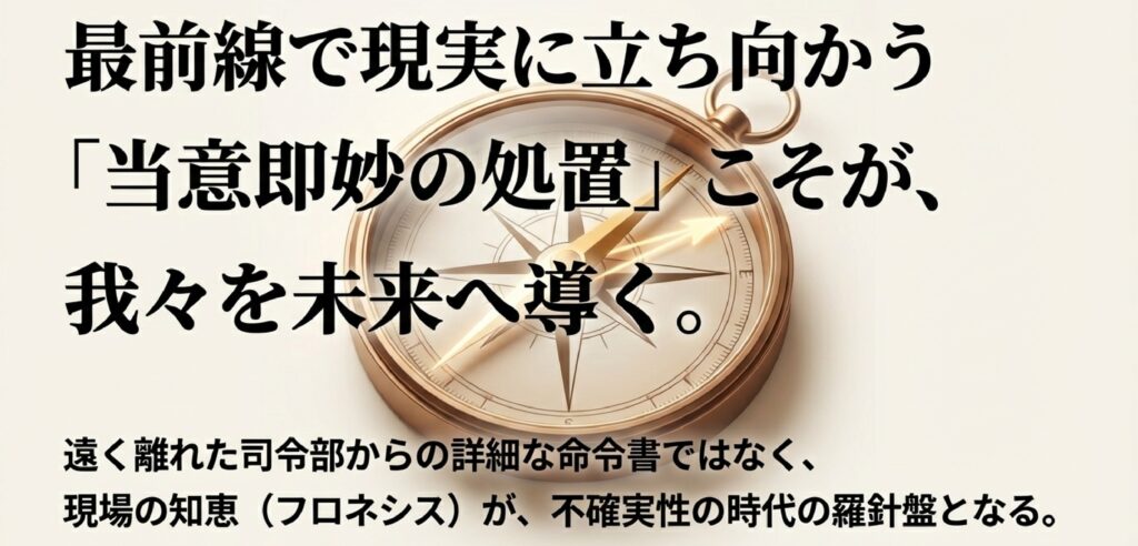 インフラの老朽化、人材の枯渇、激変する社会環境。現代の日本を取り巻く「敵」は強大かつ複雑である。この困難な戦況を突破できるのは、遠く離れた司令部からの詳細な命令書ではなく、最前線で現実に立ち向かう現場の「当意即妙の処置」に他ならない。そらゑが、現場の自律性を回復し、組織を勝利へと導くための一助となれば幸いである。